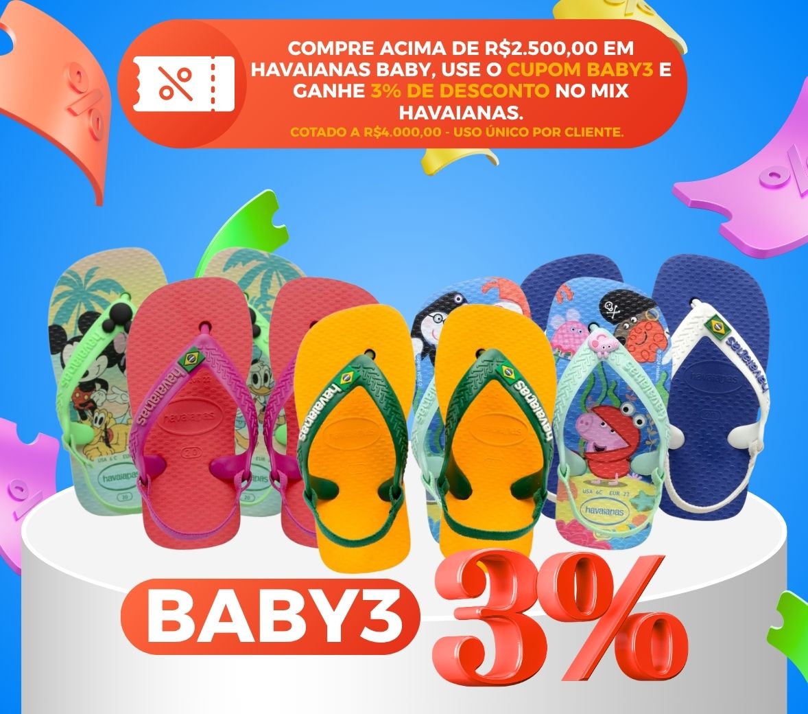 COMPRE ACIMA DE R$2.500,00 EM HAVAIANAS BABY E GANHE 3% DE DESCONTO NO MIX HAVAIANAS COM O CUPOM BABY3 LIMITADO A PEDIDOS DE 4000,00 REAIS. USO ÚNICO POR CLIENTE. Aproveite! CUPOM DE USO ÚNICO: VÁLIDO APENAS NA PRIMEIRA UTILIZAÇÃO PELO CLIENTE.