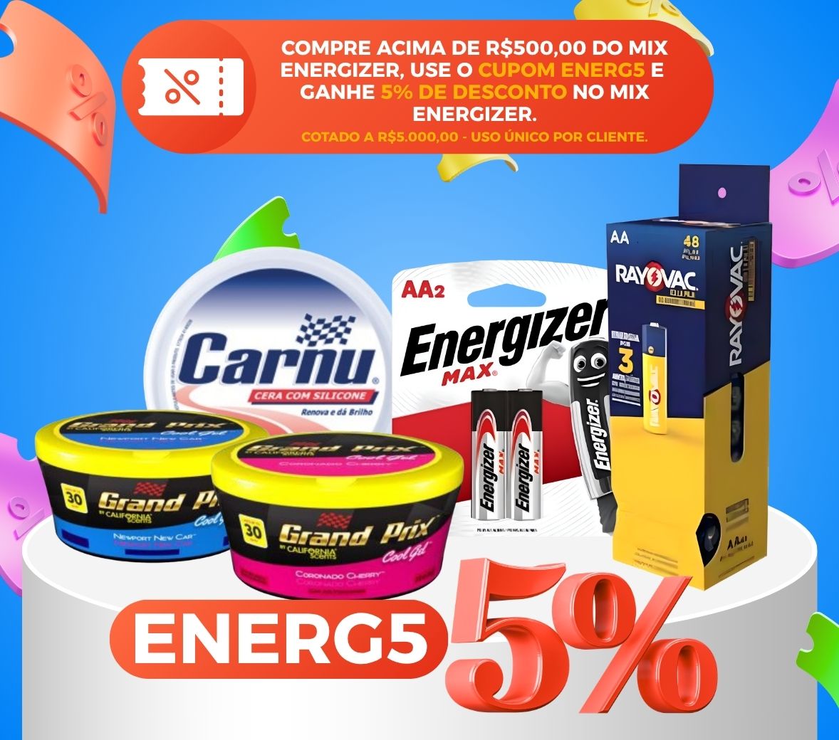 COMPRE ACIMA DE R$500,00 NO MIX ENERGIZER E GANHE 5% DE DESCONTO NO MIX ENERGIZER COM O CUPOM ENERG5 LIMITADO A PEDIDOS DE 5000,00 REAIS. USO ÚNICO POR CLIENTE. Aproveite! CUPOM DE USO ÚNICO: VÁLIDO APENAS NA PRIMEIRA UTILIZAÇÃO PELO CLIENTE.