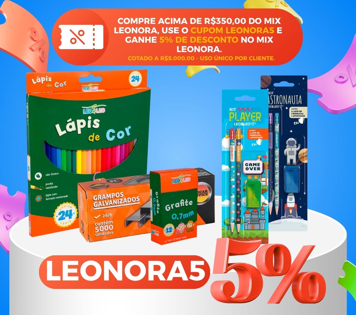 COMPRE ACIMA DE R$350,00 NO MIX LEONORA E GANHE 5% DE DESCONTO NO MIX LEONORA COM O CUPOM LEONORA5 LIMITADO A PEDIDOS DE 5000,00 REAIS. USO ÚNICO POR CLIENTE. Aproveite! CUPOM DE USO ÚNICO: VÁLIDO APENAS NA PRIMEIRA UTILIZAÇÃO PELO CLIENTE.