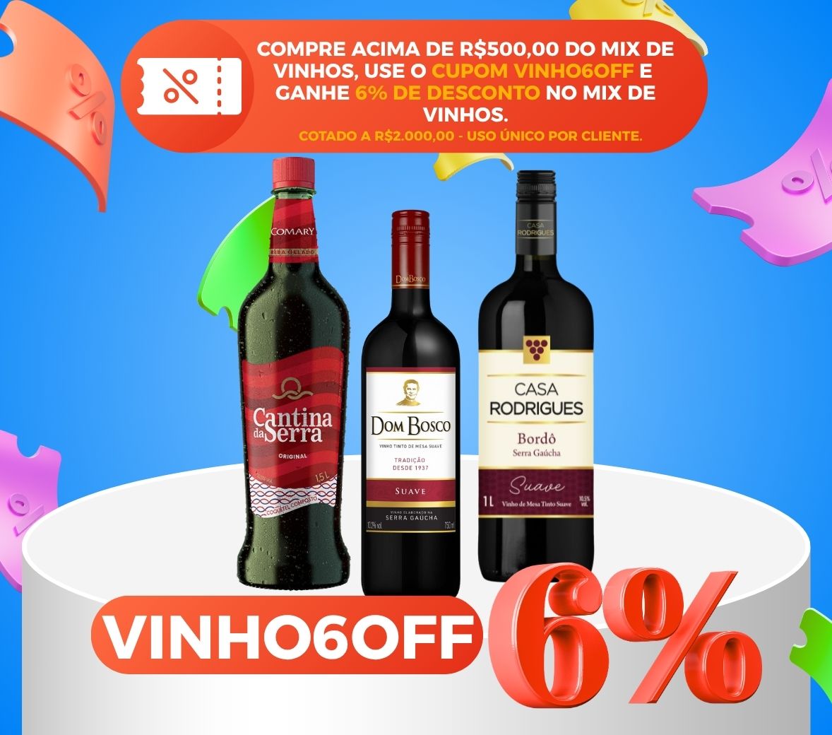 COMPRE ACIMA DE R$ 500,00 EM VINHOS E GANHE 6% DE DESCONTO NO MIX DE VINHOS COM O CUPOM VINHO6OFF, LIMITADO A R$2.000,00. Aproveite! CUPOM DE USO ÚNICO: VÁLIDO APENAS NA PRIMEIRA UTILIZAÇÃO PELO CLIENTE.