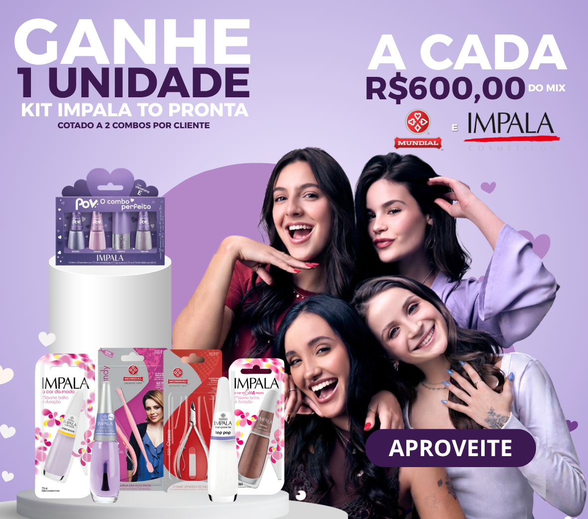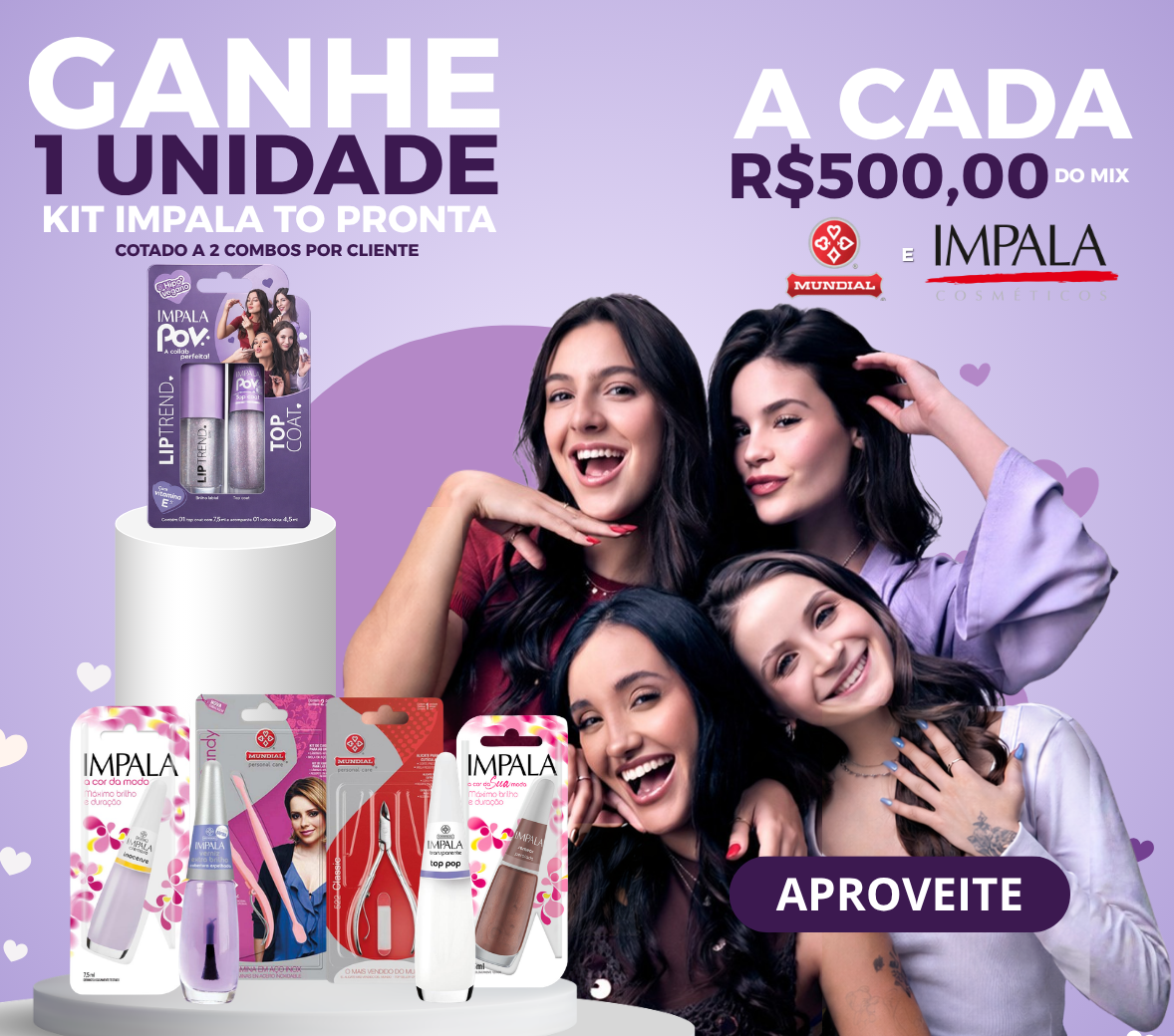 A CADA R$500,00 DO MIX MUNDIAL / IMPALA GANHE 452878 KIT IMPALA TO PRONTA 1 TOP COAT+1 GLOSS LABIAL 1X1 COTADO A 2 COMBOS POR CLIENTE. OFERTA VÁLIDA BRASIL EXC SP!