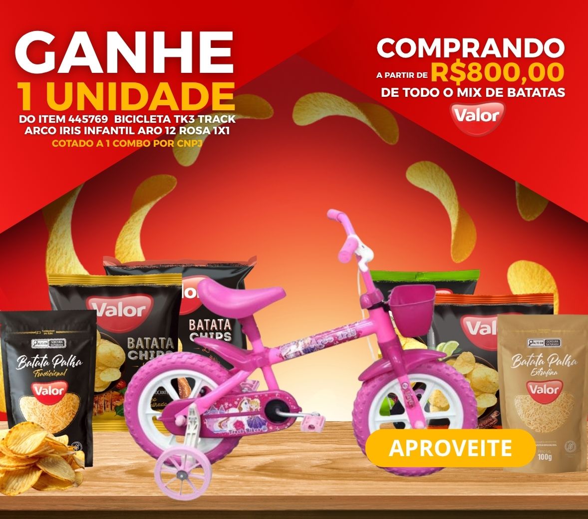 CLIENTE COMPRANDO A PARTIR DE $800,00 DE TODO O MIX DE BATATAS VALOR (CROQUES) O MESMO GANHA 1 UND DO ITEM 445769 BICICLETA TK3 TRACK ARCO IRIS INFANTIL ARO 12 ROSA 1X1 - COTADO A 1 COMBO POR CNPJ. OFERTA VÁLIDA BRASIL! Aproveite!