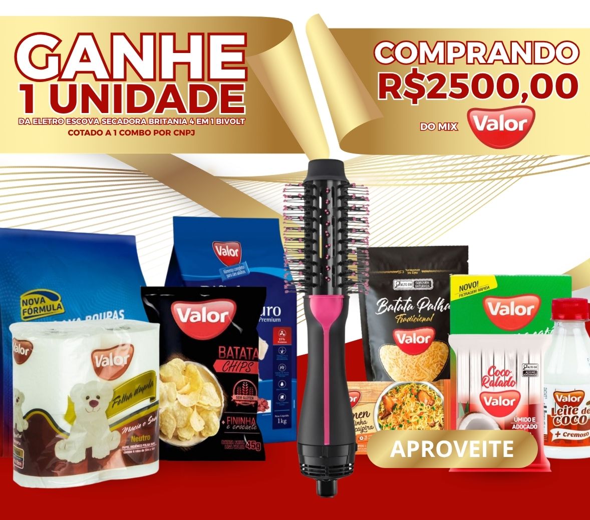 CLIENTE COMPRANDO R$2500 DE TODO O MIX VALOR IRÁ GANHAR DE BRINDE O ITEM 450967 - ELETRO ESCOVA SECADORA BRITANIA 4 EM 1 BIVOLT 1X1 – 1 COMBO POR CNPJ. OFERTA VÁLIDA SOMENTE PARA BA/CE/PI! Aproveite!
