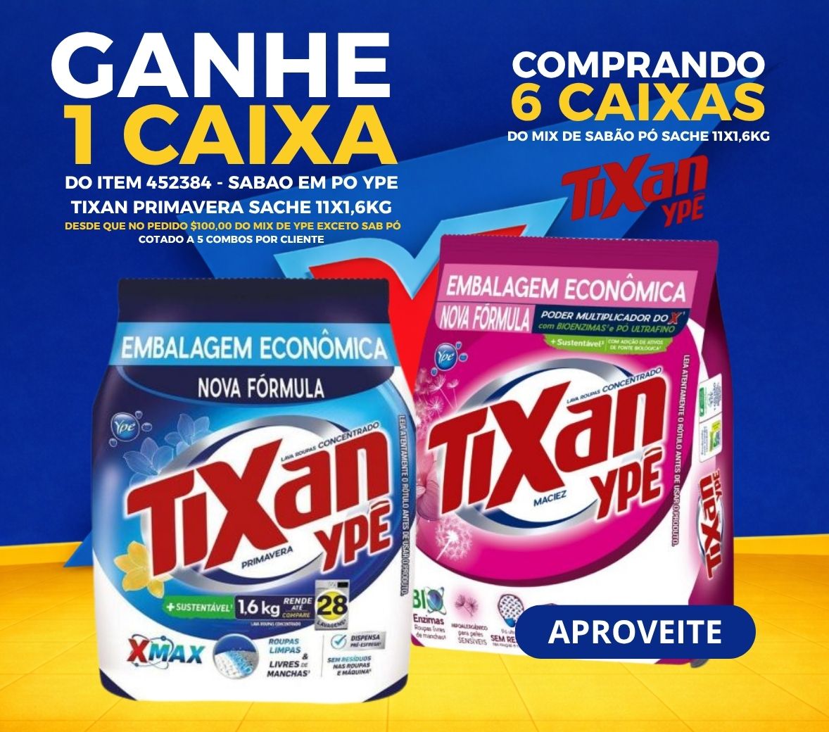 CLIENTE COMPRANDO 6CXS DO MIX DE SAB PÓ TIXAN SACHE 11X1,6KG (452385 / 452384) IRÁ GANHAR DE BRINDE 1CX DO ITEM 452384 - SABAO EM PO YPE TIXAN PRIMAVERA SACHE 11X1,6KG – DESDE QUE NO PEDIDO $100,00 DO MIX DE YPE EXCETO SAB PÓ – 5 COMBOS POR CLIENTE. OFERTA VÁLIDA APENAS PARA BA/CE/PI! Aproveite!