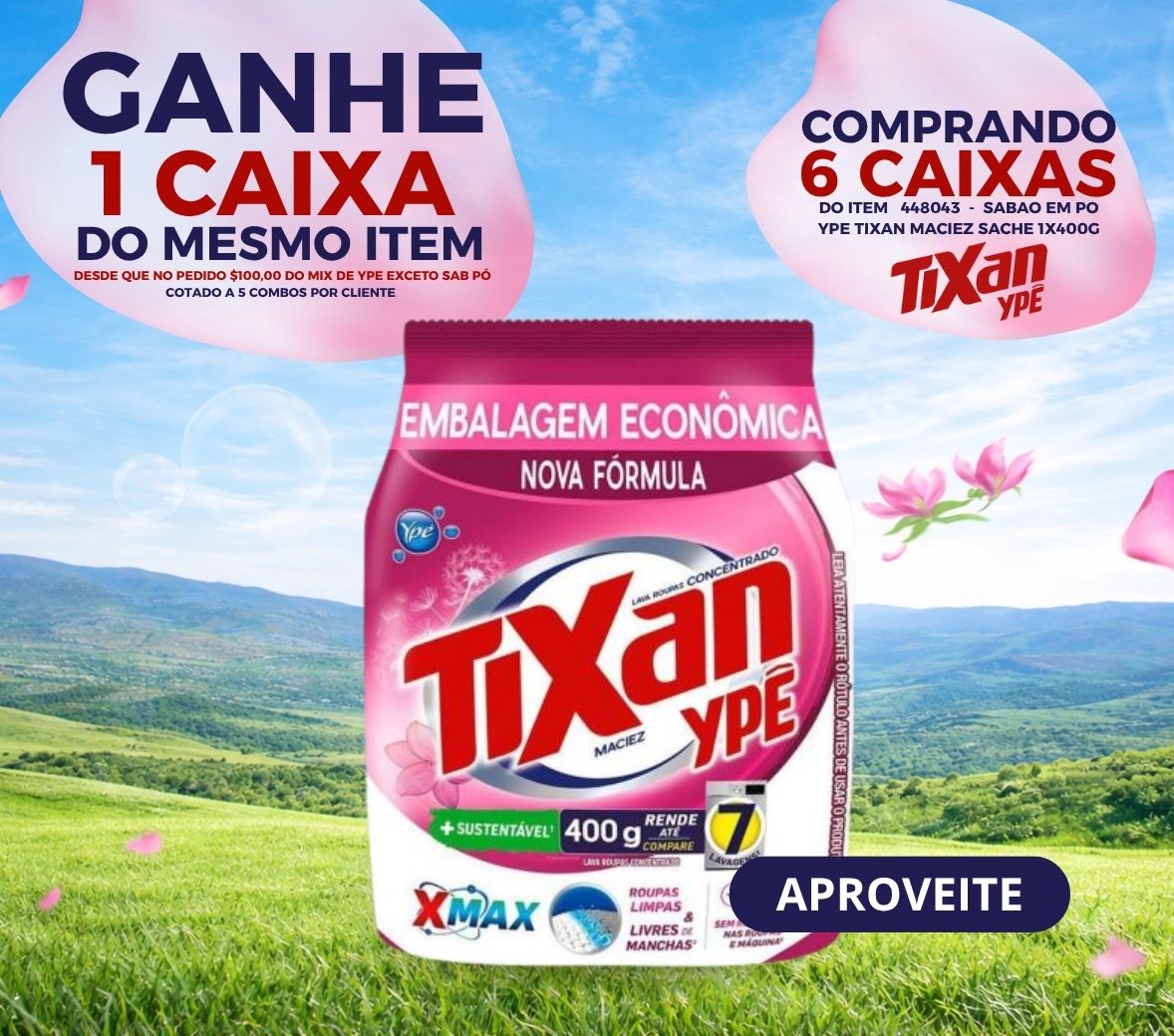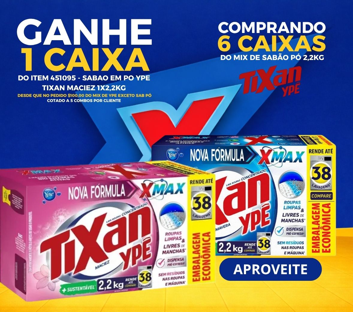CLIENTE COMPRANDO 6CXS(54UND) DO MIX DE SAB PÓ TIXAN 2,2KG ( 451095 / 446970 ) IRÁ GANHAR DE BRINDE 1CX DO ITEM 451095 - SABAO EM PO YPE TIXAN MACIEZ 1X2,2KG – DESDE QUE NO PEDIDO $100,00 DO MIX DE YPE EXCETO SAB PÓ – 5 COMBOS POR CLIENTE. OFERTA VÁLIDA BRASIL EXC BA/CE/PI! Aproveite!