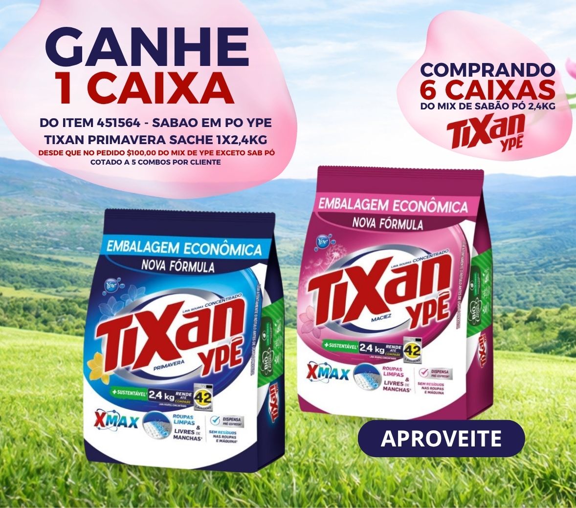 CLIENTE COMPRANDO 6CXS(48 UND) DO MIX DE SAB PÓ TIXAN 2,4KG ( 451565 / 451564 ) IRÁ GANHAR DE BRINDE 1CX DO ITEM 451564 - SABAO EM PO YPE TIXAN PRIMAVERA SACHE 1X2,4KG – DESDE QUE NO PEDIDO $100,00 DO MIX DE YPE EXCETO SAB PÓ – 5 COMBOS POR CLIENTE. OFERTA VÁLIDA BRASIL EXC BA/CE/PI! Aproveite!
