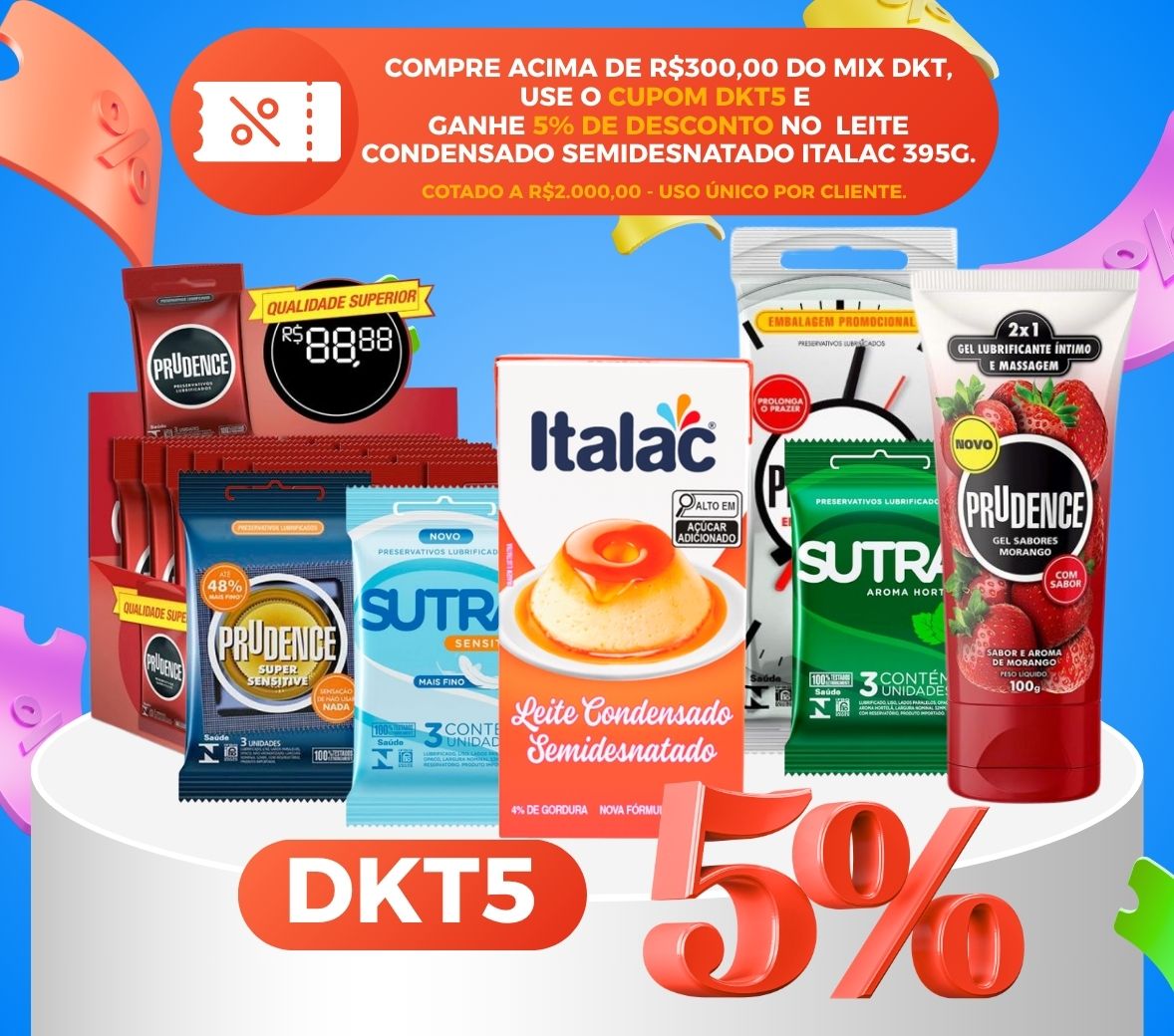 COMPRE ACIMA DE R$300,00 NO MIX DKT ORA E GANHE 5% DE DESCONTO NO 438933 LEITE CONDENSADO SEMIDESNATADO ITALAC TP 1X395G COM O CUPOM DKT5. LIMITADO A PEDIDOS DE 2000,00 REAIS. USO ÚNICO POR CLIENTE. Aproveite! CUPOM DE USO ÚNICO: VÁLIDO APENAS NA PRIMEIRA UTILIZAÇÃO PELO CLIENTE.