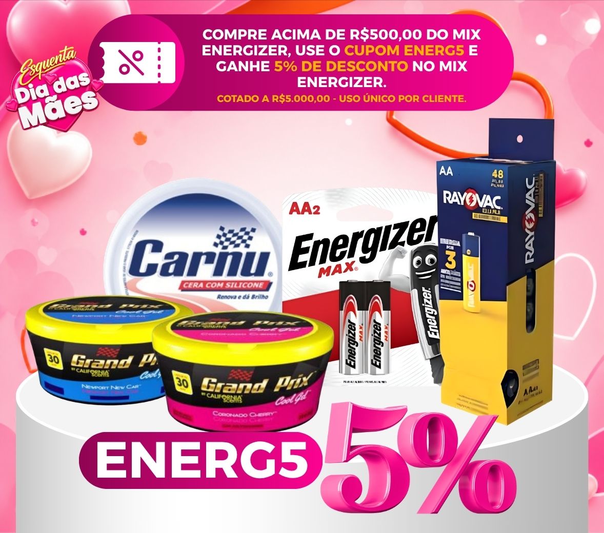 COMPRE ACIMA DE R$500,00 NO MIX ENERGIZER E GANHE 5% DE DESCONTO NO MIX ENERGIZER COM O CUPOM ENERG5 LIMITADO A PEDIDOS DE 5000,00 REAIS. USO ÚNICO POR CLIENTE. Aproveite! CUPOM DE USO ÚNICO: VÁLIDO APENAS NA PRIMEIRA UTILIZAÇÃO PELO CLIENTE.