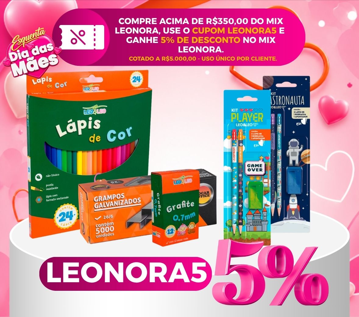 COMPRE ACIMA DE R$350,00 NO MIX LEONORA E GANHE 5% DE DESCONTO NO MIX LEONORA COM O CUPOM LEONORA5 LIMITADO A PEDIDOS DE 5000,00 REAIS. USO ÚNICO POR CLIENTE. Aproveite! CUPOM DE USO ÚNICO: VÁLIDO APENAS NA PRIMEIRA UTILIZAÇÃO PELO CLIENTE.