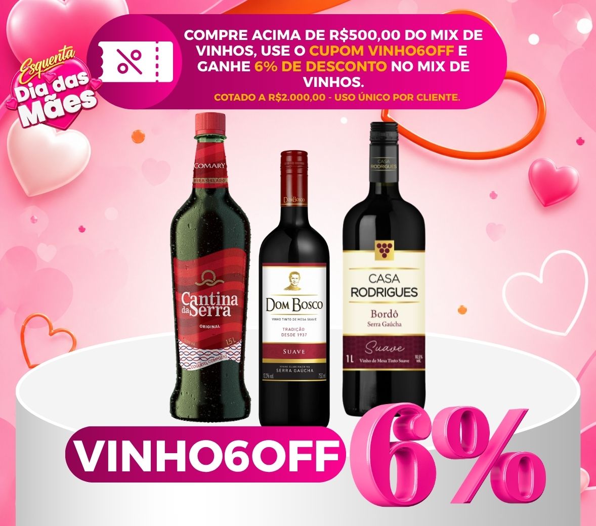 COMPRE ACIMA DE R$ 500,00 EM VINHOS E GANHE 6% DE DESCONTO NO MIX DE VINHOS COM O CUPOM VINHO6OFF, LIMITADO A R$2.000,00. Aproveite! CUPOM DE USO ÚNICO: VÁLIDO APENAS NA PRIMEIRA UTILIZAÇÃO PELO CLIENTE.