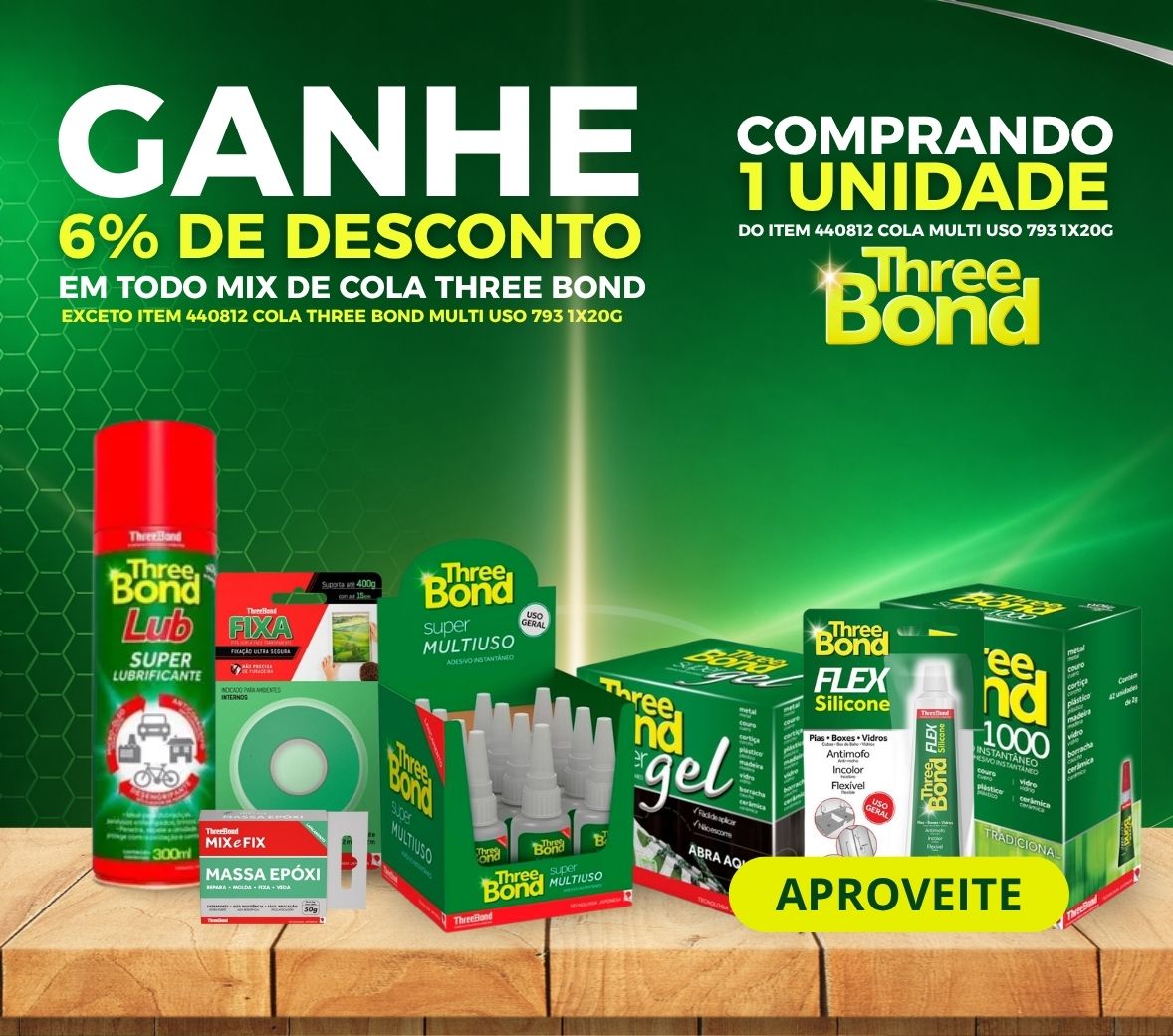 COMPRANDO 1 UND DO ITEM 440812 COLA THREE BOND MULTI USO 793 1X20G, CLIENTE GANHA 6% EM TODO MIX DE COLA THREE BOND, EXCETO ITEM ITEM 440812 COLA THREE BOND MULTI USO 793 1X20G. Oferta válida Brasil EXC BA/CE/PI!