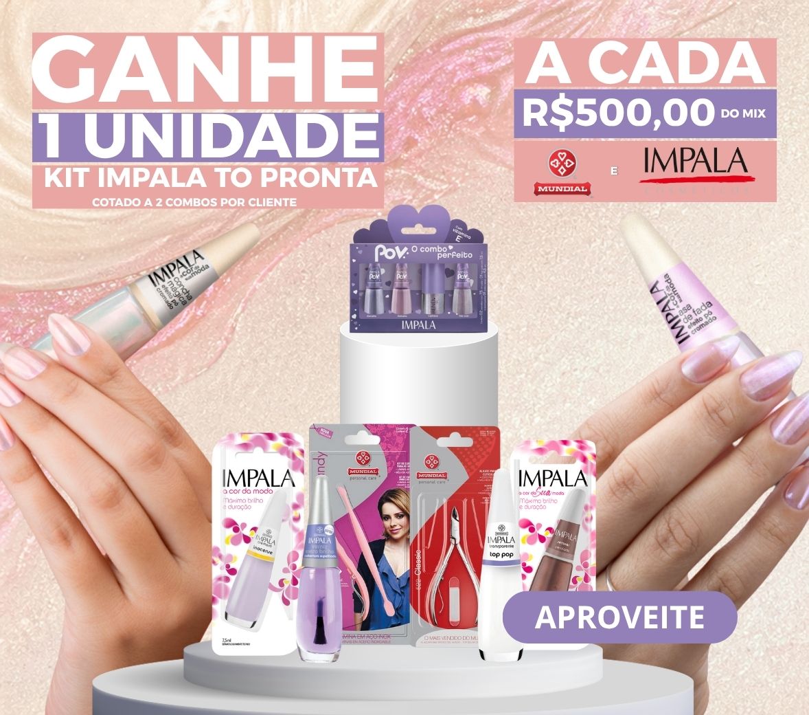 A CADA R$600,00 DO MIX MUNDIAL / IMPALA GANHE 452882 KIT IMPALA TO PRONTA 2 ESMALTE+1 TOP COAT+1 GLOSS 1X1 COTADO A 2 COMBOS POR CLIENTE. OFERTA VÁLIDA SOMENTE PARA SP!