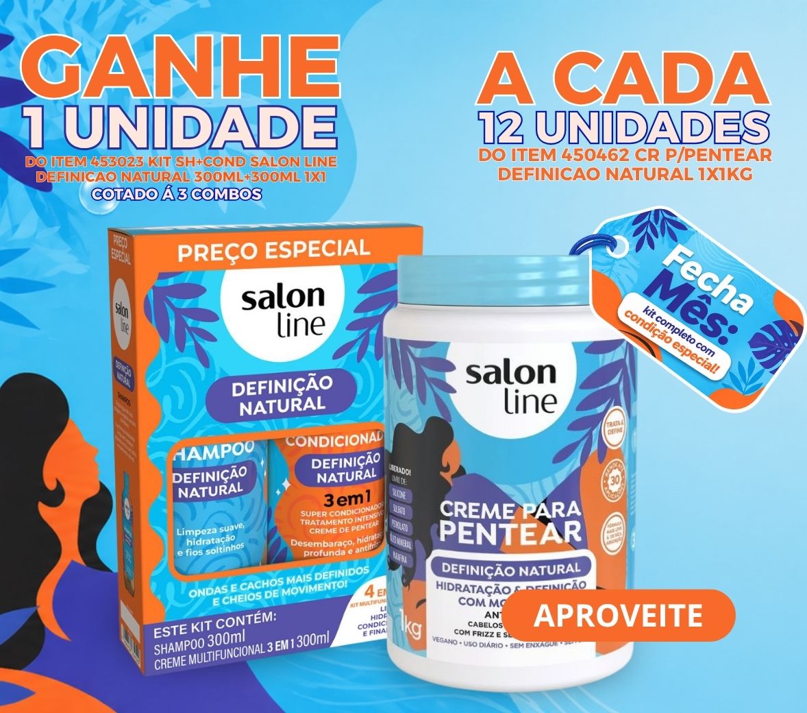 A CADA 2 CAIXAS DO ITEM 450462 CR P/PENTEAR SALON LINE DEFINICAO NATURAL 1X1KG (12 UNIDADES), GANHE 1 UNIDADE DE 453023 KIT SH+COND SALON LINE DEFINICAO NATURAL 300ML+300ML 1X1, COTADO Á 3 COMBOS POR CLIENTE! Aproveite! Oferta válida somente para BA-CE-PI-MA!
