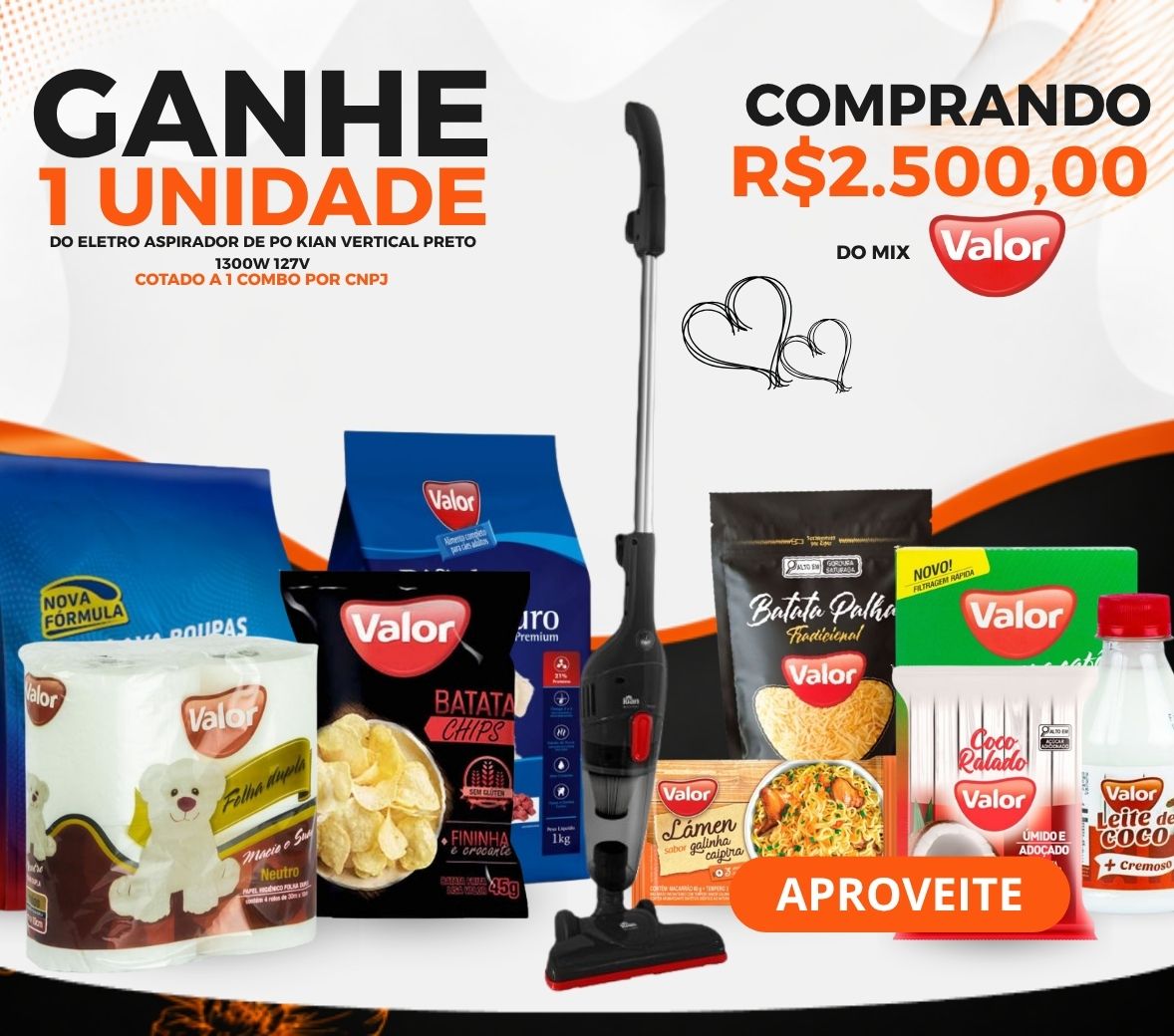 CLIENTE CLIENTE COMPRANDO R$2500 DE TODO O MIX VALOR IRÁ GANHAR DE BRINDE O ITEM 453369 - ELETRO ASPIRADOR DE PO KIAN VERTICAL PRETO 1300W 127V 1X1 – 1 COMBO POR CNPJ. OFERTA VÁLIDA BRASIL EXC BA/CE/PI/TO/MA!