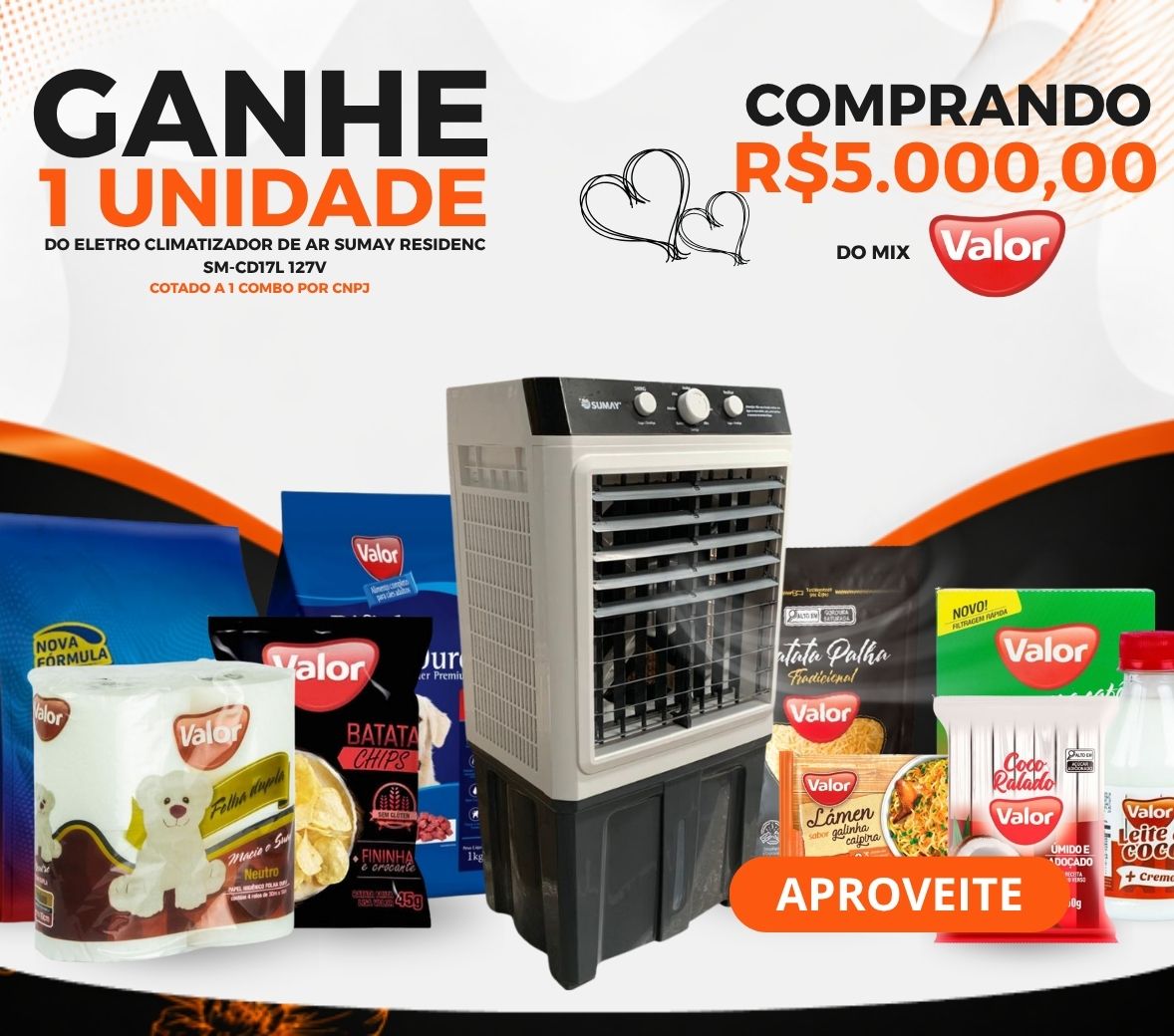 CLIENTE COMPRANDO R$5000 DE TODO O MIX VALOR IRÁ GANHAR DE BRINDE O ITEM 453365 -ELETRO CLIMATIZADOR DE AR SUMAY RESIDENC SM-CD17L 127V 1X1 – 1 COMBO POR CNPJ. OFERTA VÁLIDA BRASIL EXC BA/CE/PI/TO/MA!