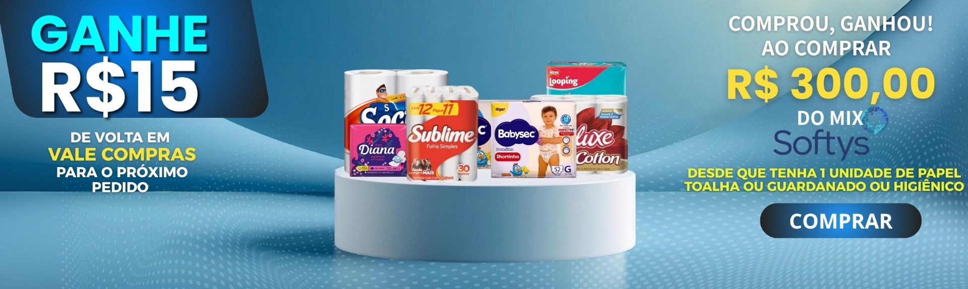 Ao comprar R$300,00 no MIX Softys , você recebe R$15,00 de volta do valor total para o próximo pedido!