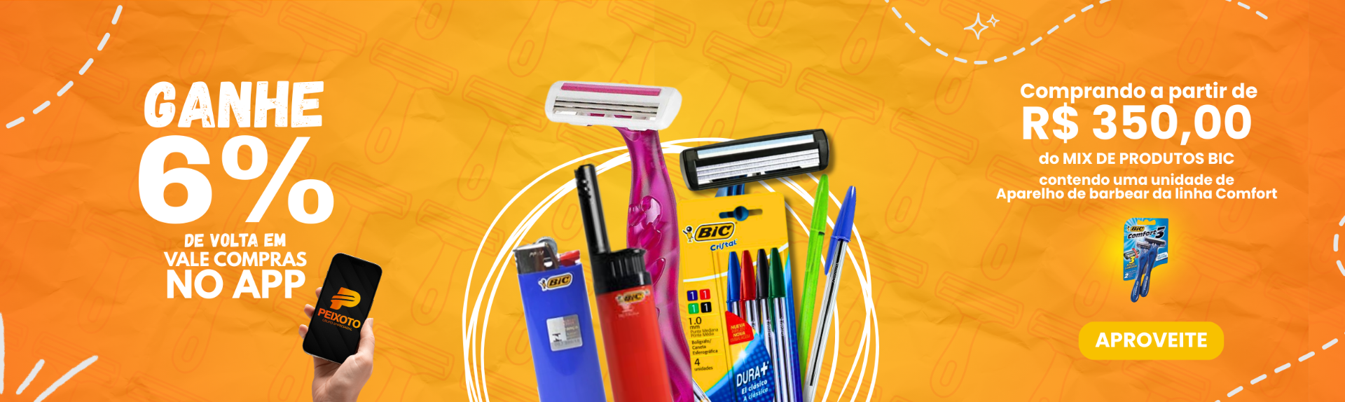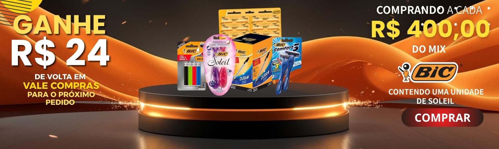 A cada R$400,00 em produtos do MIX de BIC,contendo uma unidade deSoleil , você recebe R$24,00 de volta do valor total para o próximo pedido!